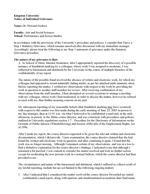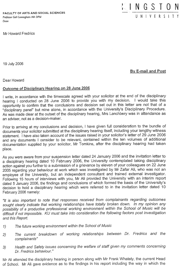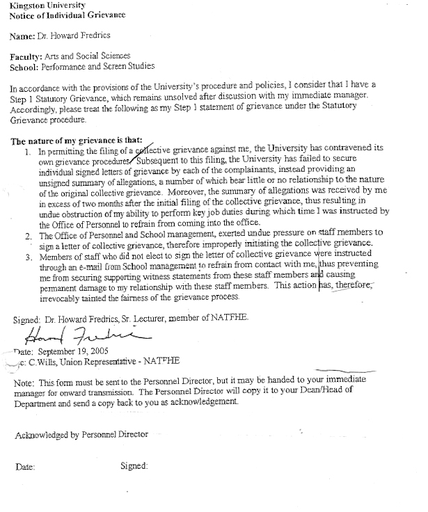 According to Kingston University, a collective grievance was filed by a group of Dr Fredrics' colleagues, motivated by genuine concerns that they supposedly had about working with Dr Fredrics.