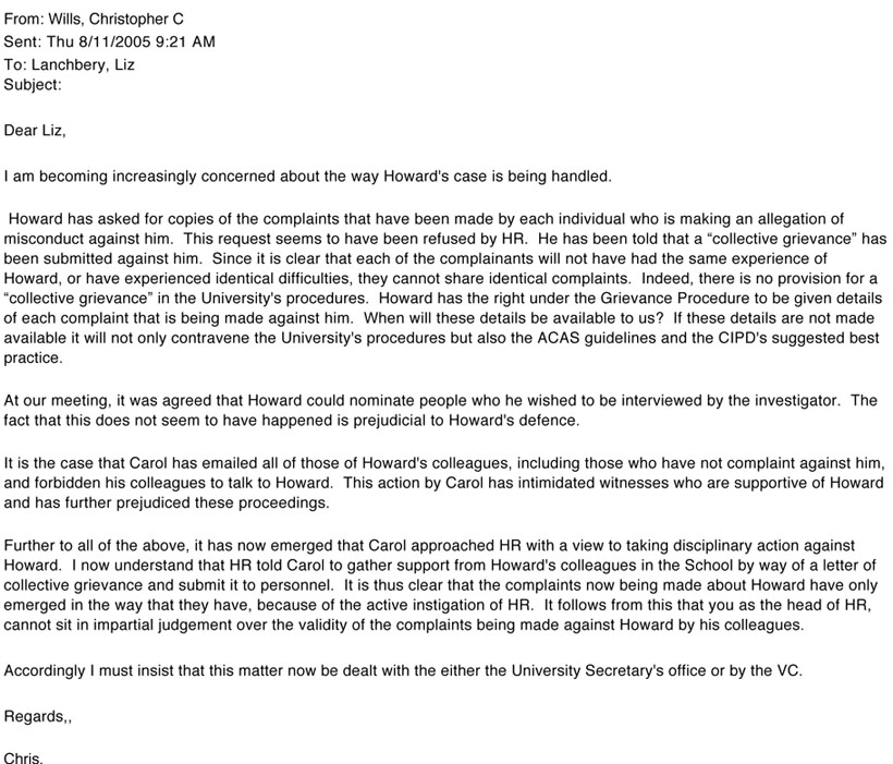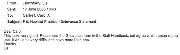The following is an e-mail from Dr Fredrics' union representative, Chris Wills to Liz Lanchbery in which Mr Wills raises concerns about the grievance process and the way in which it was initiated and conducted:-