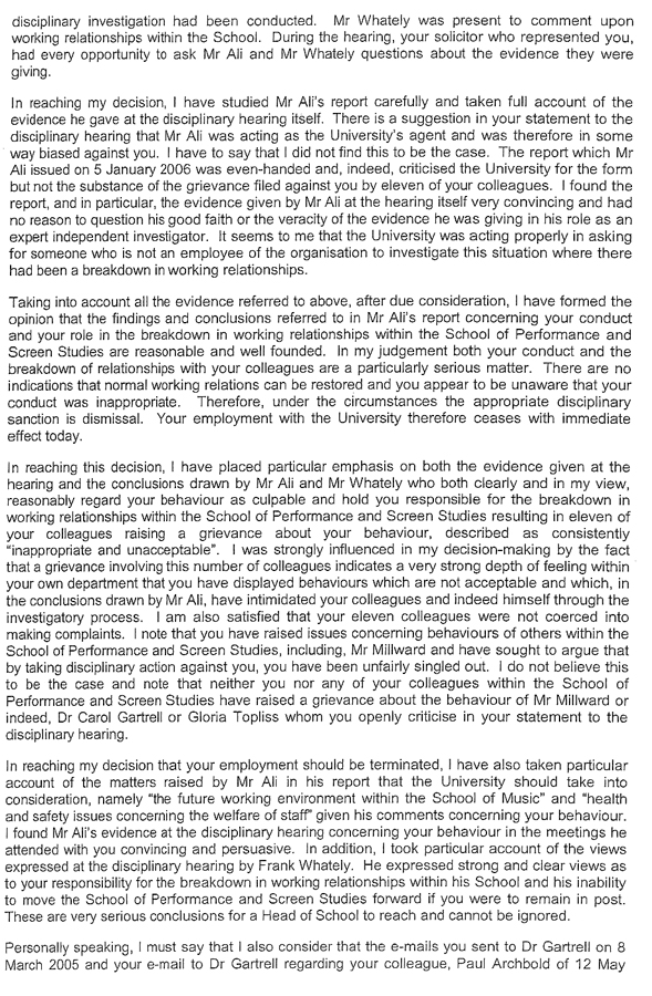Carol Gartrell was Acting Head of School of Music at the time that a collective grievance was filed on 22 June 2005 by eleven of Senior Lecturer, Dr Fredrics' colleagues.