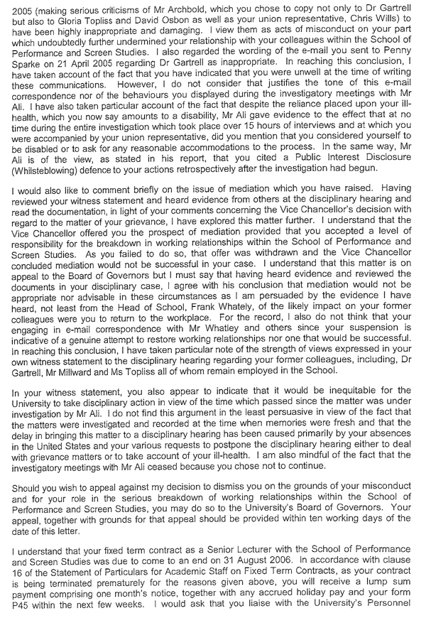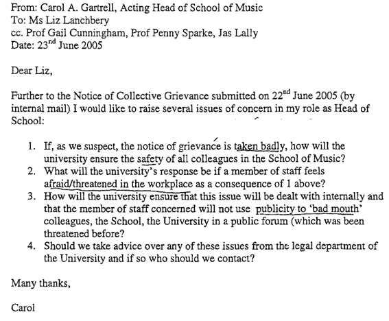 Here's what Dr Gartrell wrote to Gail Cunningham, Dean of FASS, Penny Sparke, Dean of Art, Design and Music, and Liz Lanchberry (aka Liz Scholey), Director of Personnel when she sent them her draft of the grievance and requested advice on changes and amendments.