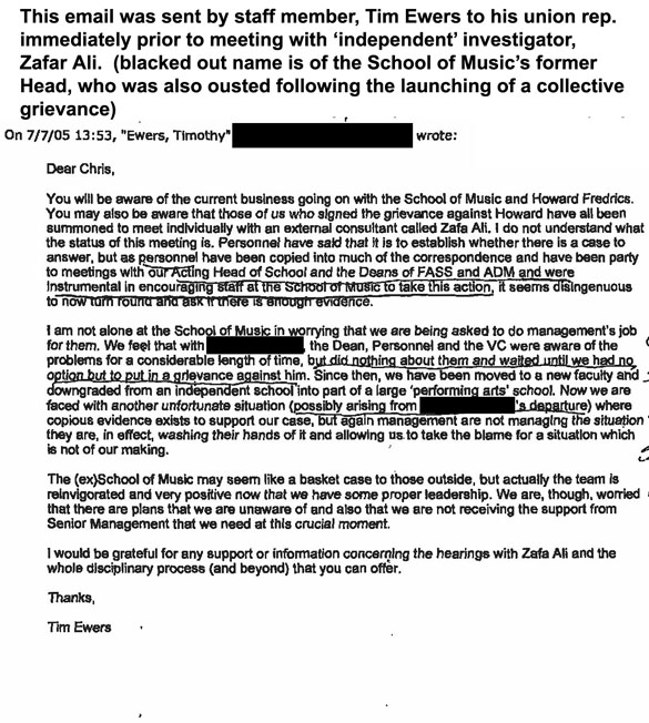 Tim Ewers, one of the staff members who was asked by Dr Gartrell to attend a meeting to "check that nothing falls 'between the gaps'" then wrote on 7 July 2005 to his union rep. In this letter, Dr Ewers reveals some interesting background about how the collective grievance was developed and initiated. He also demonstrates that this was not the first collective grievance to be put forward in the School of Music.