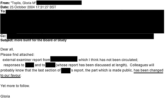 The following is an e-mail from Ms Gloria Toplis, BMus Course Director sent several months after Mr Searby's call for staff to "ask her [the External Examiner] to amend" her report:-