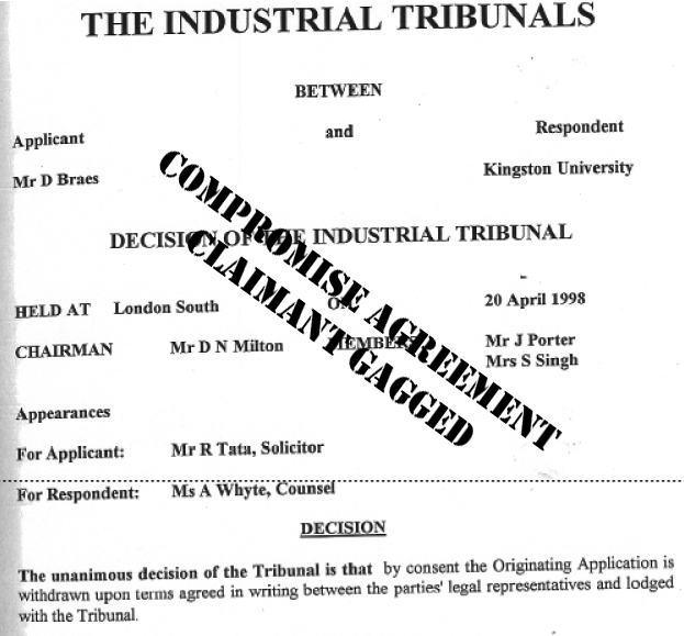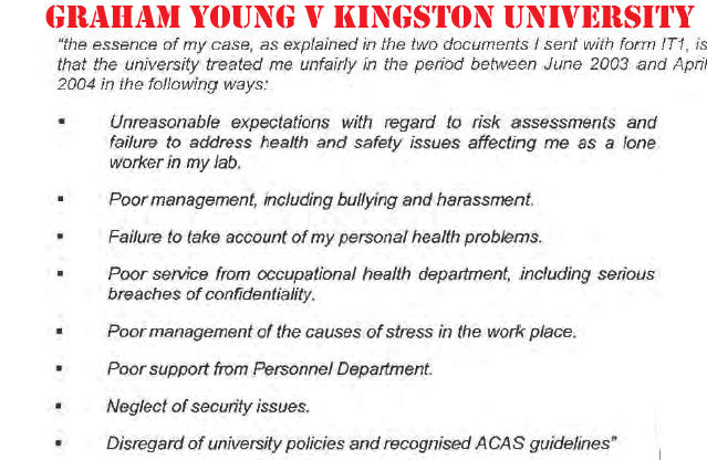 This section of the site provides examples drawn from the numerous Employment Tribunal and personal harassment cases filed against Kingston University by its employees and students since 1997, when Sir Peter Scott took over as Vice-Chancellor.