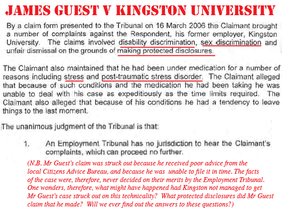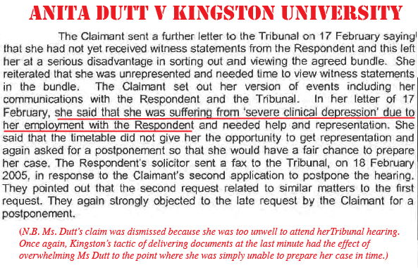 Or could it be that Kingston's treatment of staff and students caused such severe injuries as well as financial loss to these staff members so as to render them distinctly disadvantaged against Kingston University, with its highly paid team of barristers and solicitors -- all paid for at taxpayer expense?