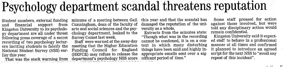 There is one key passage that the Comet gets wrong in its account of the aftermath of the NSS scandal: It is confirmed according to the actual minutes of a 'training event' held in the Department of Psychology, that Prof Gail Cunningham, Dean of the Faculty of Arts and Social Sciences, informed staff that "As a result HEFCE has decided that the Psychology NSS score cannot be released this year."