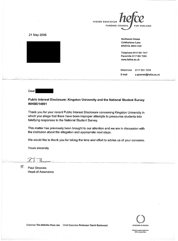 If she was not telling the truth, could it be that Prof Cunningham was attempting to intimidate staff members into silence by telling them that they would suffer damage to their careers as a result of the University being sanctioned by HEFCE in connection with the National Student Survey scandal?