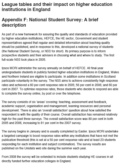For those who are unfamiliar with the National Student Survey and its stated purpose, the following document published by HEFCE (Higher Education Funding Council of England) offers a clear outline. Interestingly, there appears to be no specific intent for the survey to be utilized by prospective employers in determining the quality of degrees received by students:-
